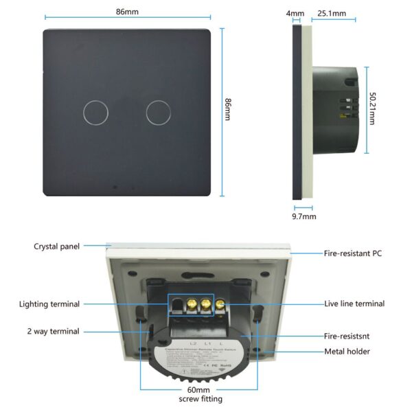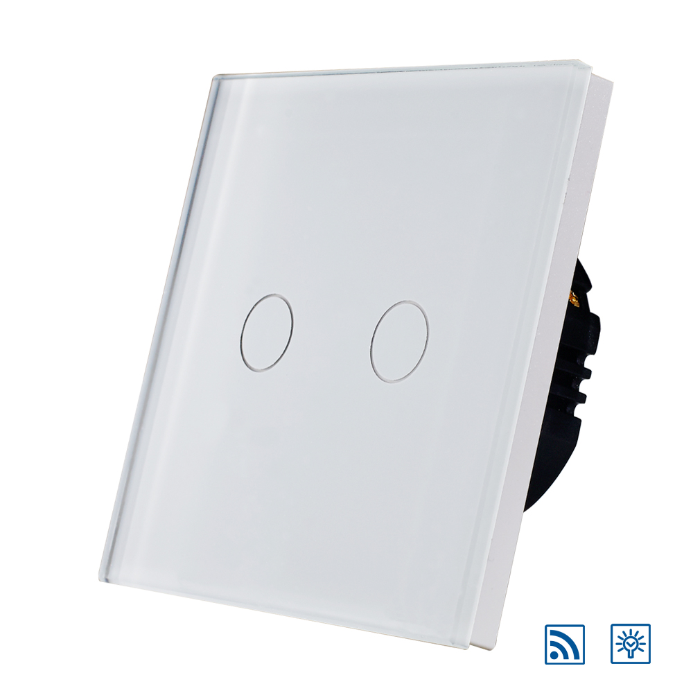 کلید دو پل لمسی (هوشمند) با فریم شیشه در چهار رنگ سفید، مشکی، طوسی ، طلایی شامل دو بخش مکانیزم کلید و فریم شیشه می باشد که در بسته بندی شکیل ارائه می گردد. این محصول ساخت کشور چین می باشد و از نظر کیفیت بسیار بی نقص عمل می کند به گونه ای که دارای 4 سال ضمانت تعویض روبیتا (خودمان) از تاریخ خرید می باشد.